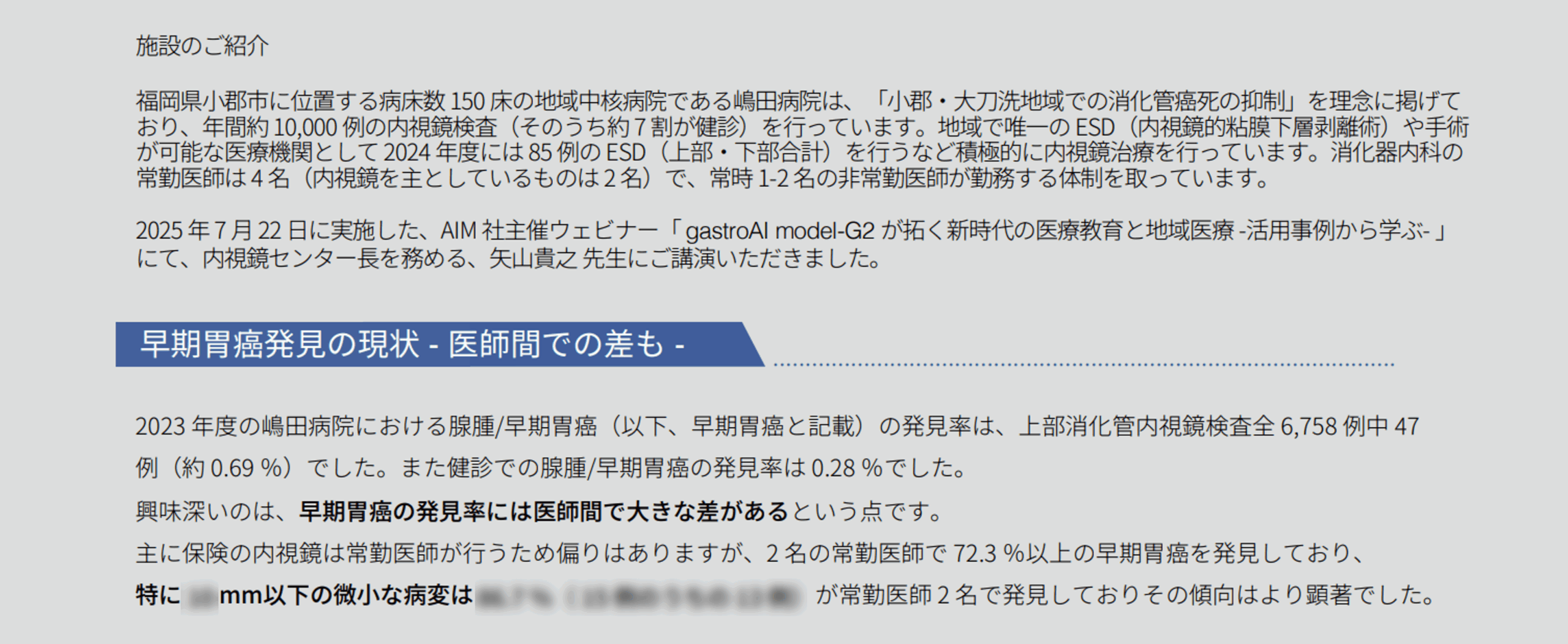 社会医療法⼈シマダ 嶋⽥病院におけるgastroAI model-G2の施設導入事例紹介となります。製品の資料請求・お問い合わせはこちら